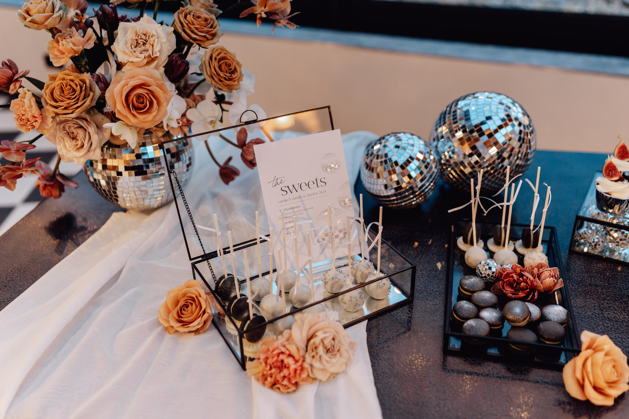 Ein weiteres Highlight: die Hochzeitstorte. Mit ihren dekorativen Blüten und dem eleganten Design ist sie fast zu schön, um sie anzuschneiden. Und für alle, die nicht genug von süßen Leckereien bekommen können, gibt es den Sweet Table: Macarons, Cupcakes und Cakepops im Discodesign – glitzernd, kreativ und einfach unwiderstehlich.