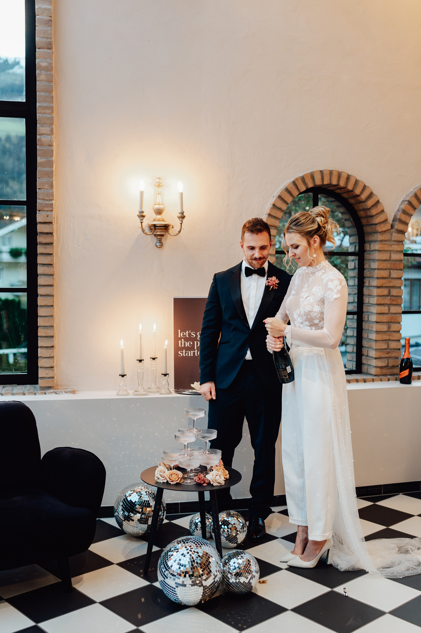 Mitten in der beeindruckenden Bergwelt von Österreich erwartet euch eine Hochzeit, die alles ist, außer gewöhnlich. Statt rustikalem Hüttenflair erwartet euch eine coole Mischung aus urbanem Stil und lässigen Disco-Vibes. Funkelnde Spiegelkugeln, moderne Designs und eine Atmosphäre, die so viel mehr ist als „nur“ Hochzeit. Dieses Konzept zeigt, wie ihr eure Berghochzeit genauso feiern könnt, wie ihr seid – frisch, modern und unvergesslich.