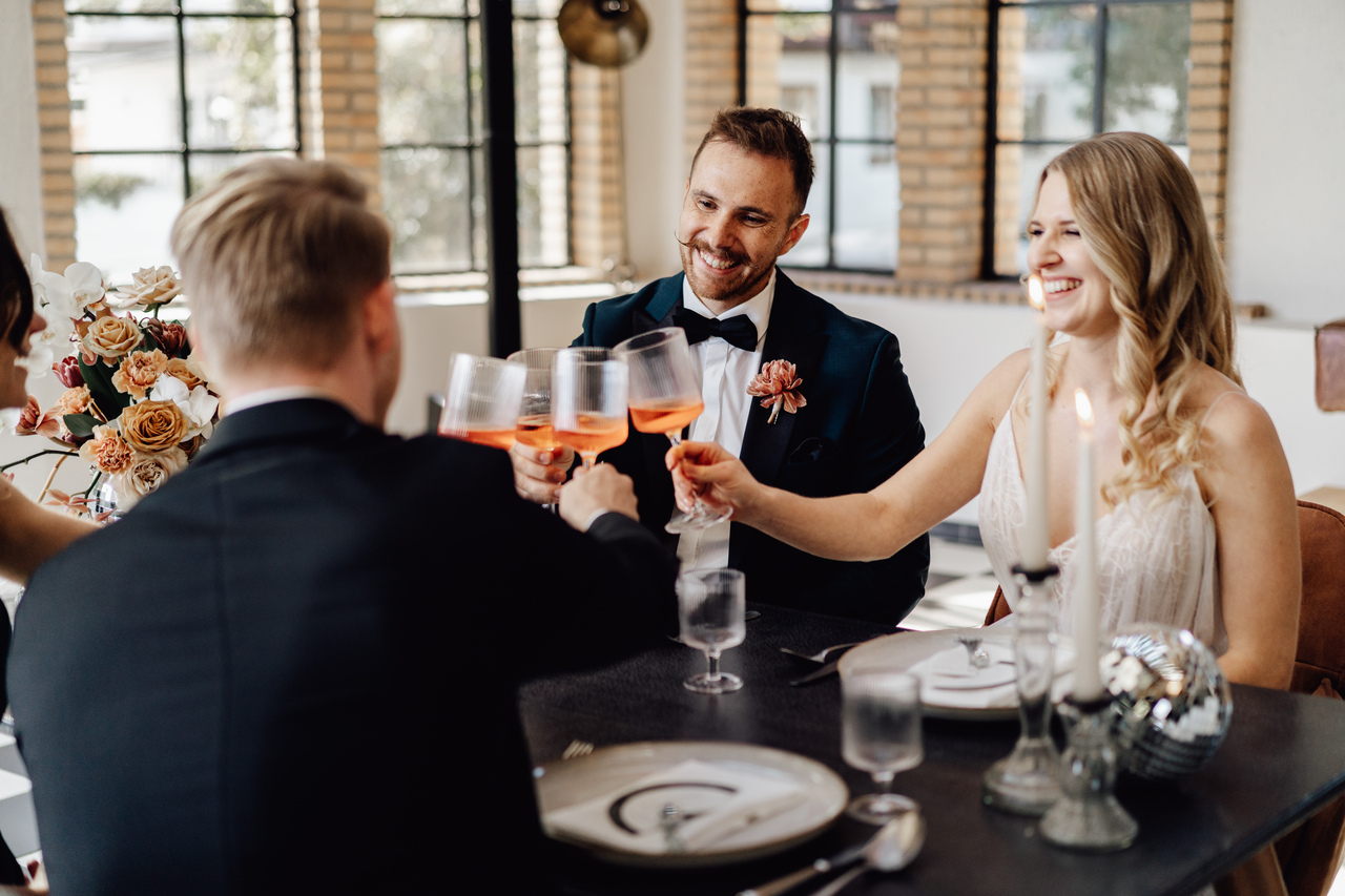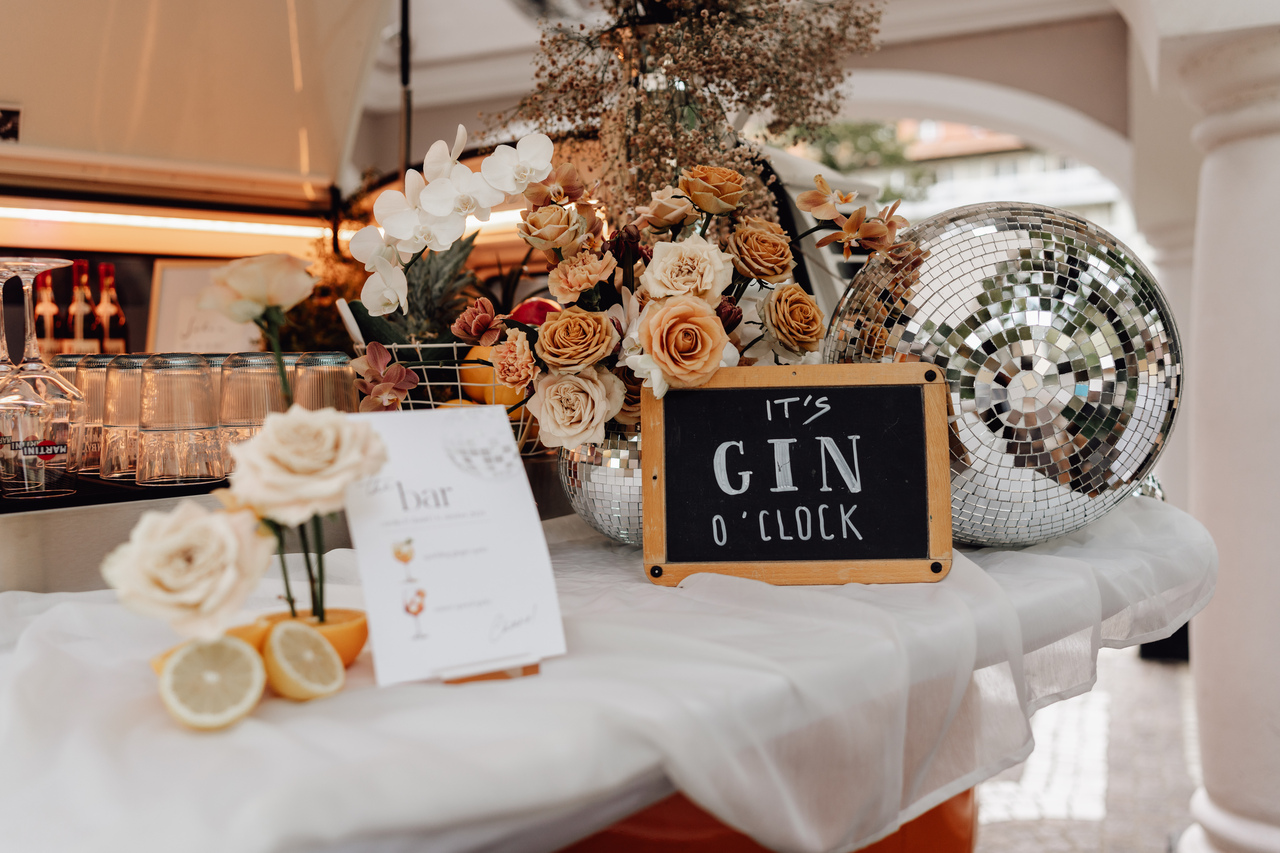 Jede Berghochzeit wird erst durch die kleinen, liebevoll durchdachten Details wirklich besonders – und bei diesem Konzept passt alles perfekt zusammen. Die Papeterie mit ihrem klaren Design und modernen Schriftzügen greift das Disco-Feeling der Feier auf. Die Tischdeko setzt mit kräftigen Farben und Kupferakzenten Highlights, die sofort ins Auge fallen. Locker arrangierte Blumen runden den Look ab und schaffen eine einladende, stilvolle Atmosphäre.