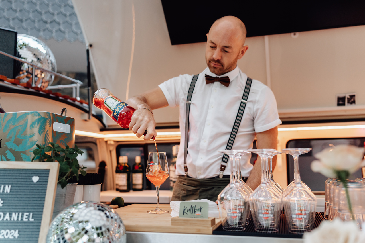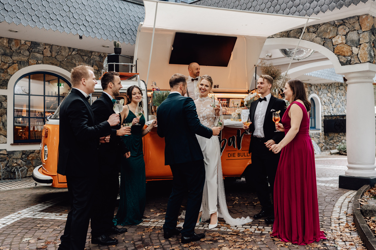 Der Empfang ist der perfekte Einstieg in eure Berghochzeit – und die Bullibar macht ihn zu etwas ganz Besonderem. Der charmante, umgebaute Vintage-Bulli ist nicht nur ein Hingucker, sondern bringt mit seinen spritzigen Cocktails und kühlen Drinks sofort gute Laune ins Spiel. Ob Prosecco, Aperol Spritz oder alkoholfreie Optionen – hier ist für jeden Geschmack etwas dabei.