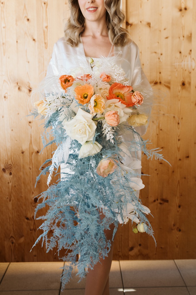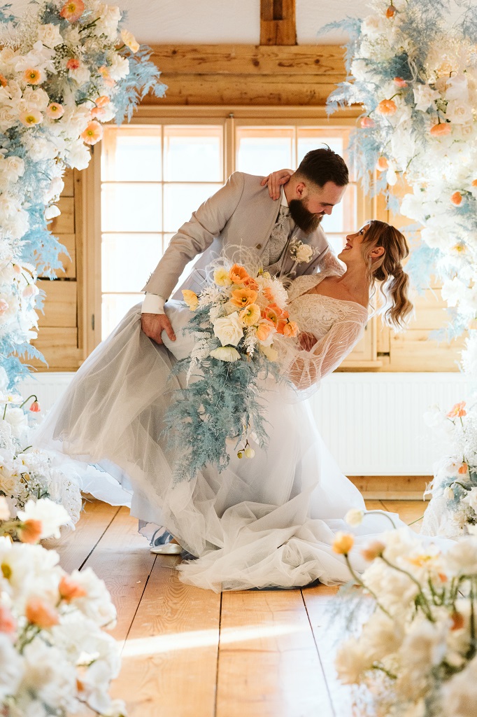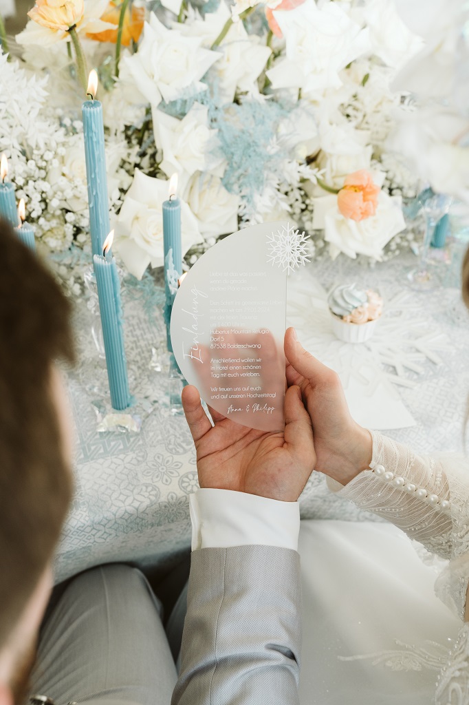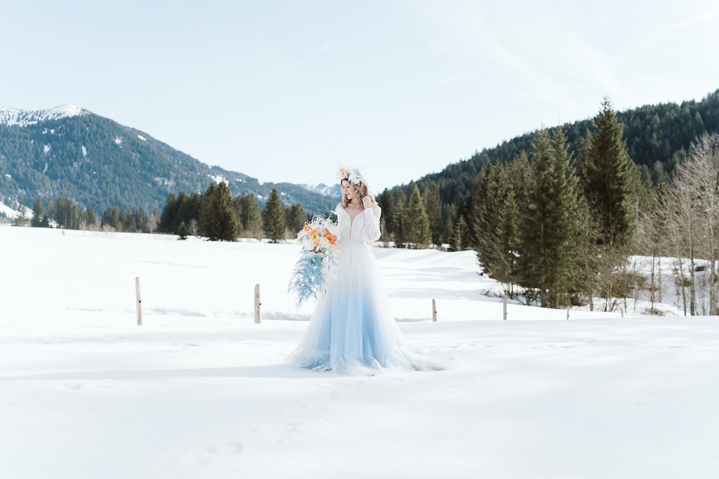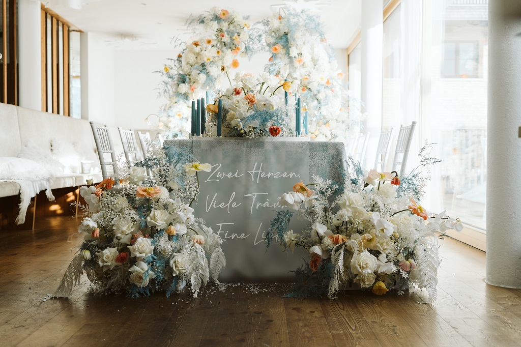 Besonders an diesem Konzept ist der Verzicht auf die klassischen Winterfarben wie Rot, Gold oder Grün, die sonst häufig bei Alpenhochzeiten zum Einsatz kommen. Stattdessen stehen moderne, kühle Töne im Mittelpunkt, die frische Leichtigkeit in die winterliche Atmosphäre bringen und dem Konzept einen einzigartigen Stil verleihen.