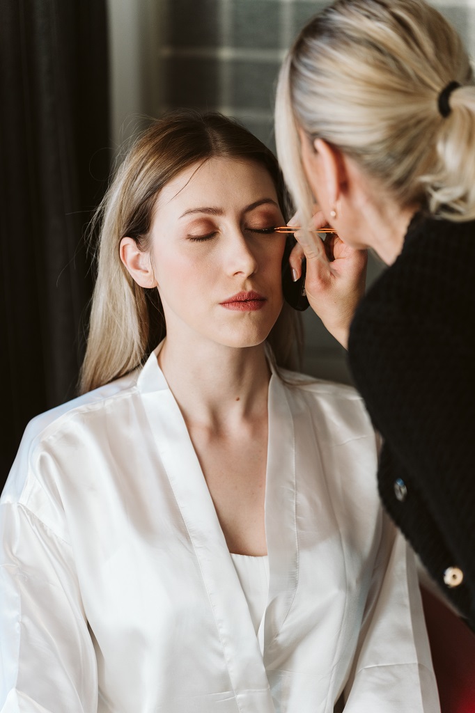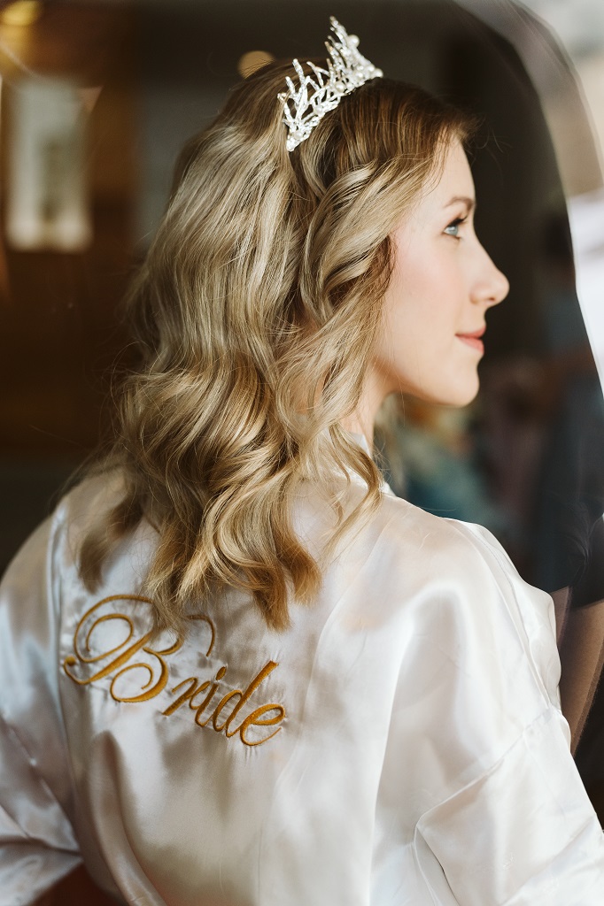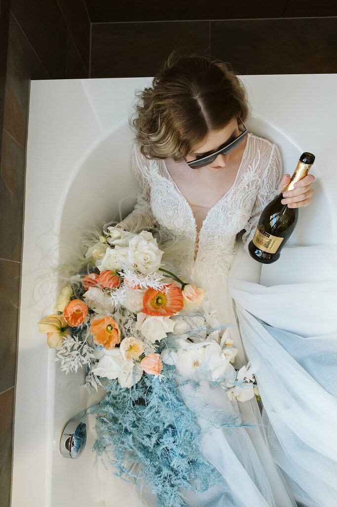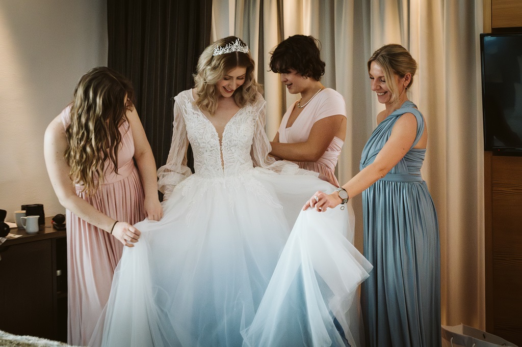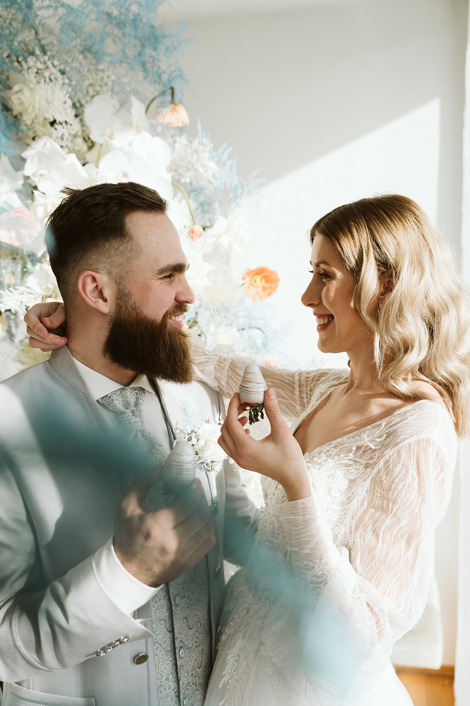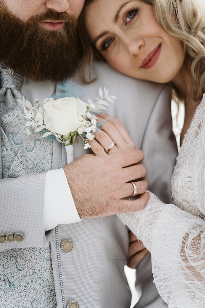 Das Brautkleid ist ein echter Hingucker: Der Rock wird passend zum Farbkonzept kunstvoll eingefärbt und setzt mit seinen sanften Farbverläufen einen besonderen Akzent. Feiner Glitzer auf dem Stoff lässt das Kleid bei jeder Bewegung schimmern und verleiht ihm eine traumhafte Note. Der Bräutigam trägt einen stilvollen Anzug in einem modernen, hellen Farbton, der das winterliche Ambiente unterstreicht und mit seiner lockeren, eleganten Silhouette perfekt zum Gesamtkonzept passt.