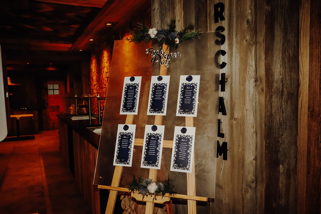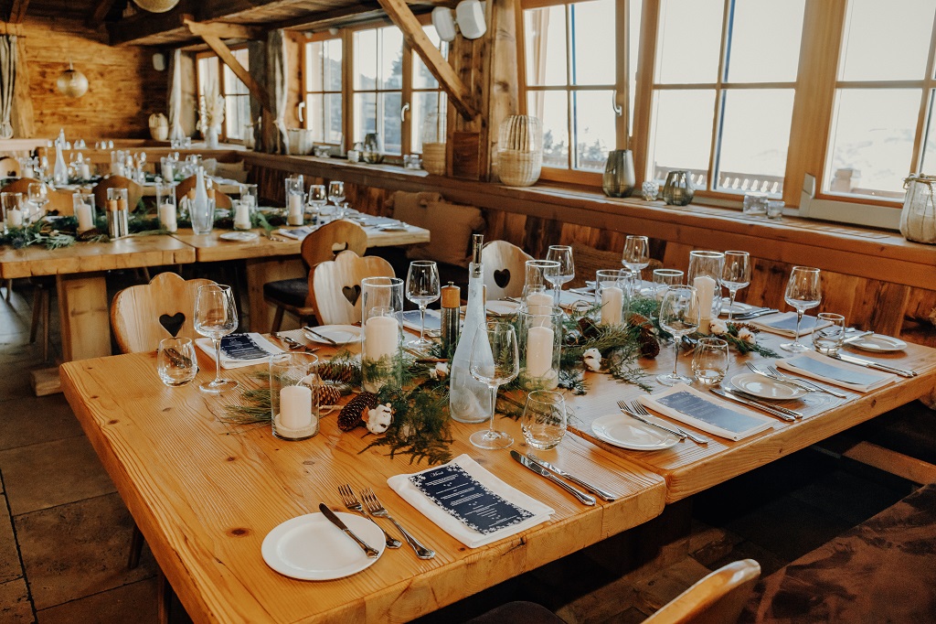 Auf den Tischen finden sich Arrangements aus Blumen und Zweigen, die wie mit Frost überzogen wirken. Feine, dezente Details wie schimmernde Tischkarten oder silberne Platzhalter bringen einen eleganten Touch, ohne zu überladen zu wirken. Kerzen in verschiedenen Größen sorgen für eine warme, behagliche Stimmung – genau das, was eine Alpenhochzeit im Winter in Österreich ausmacht.
