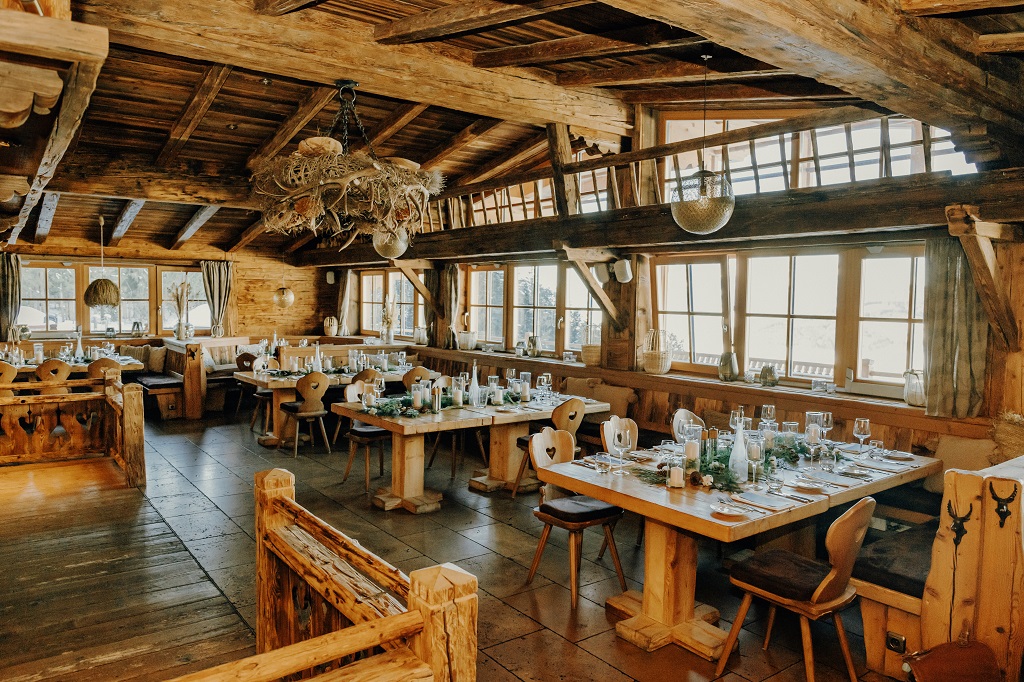 Das warme Holzdesign kombiniert mit großen Fenstern, die die Winterlandschaft einrahmen, sorgt für eine entspannte und gleichzeitig festliche Atmosphäre. Kleine Highlights wie flackernde Kamine, kuschelige Felle und stimmungsvolle Beleuchtung machen die Location besonders einladend. Hier spürt man: Alles wurde so gestaltet, dass ihr euch rundum wohlfühlen könnt. Eine Berghochzeit in Österreich verbindet diese gemütliche Atmosphäre mit der beeindruckenden Naturkulisse der Alpen.